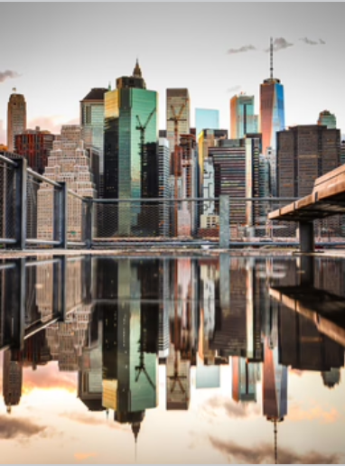 View of Manhattan from a puddle in Brooklyn on a rainy New York City day.